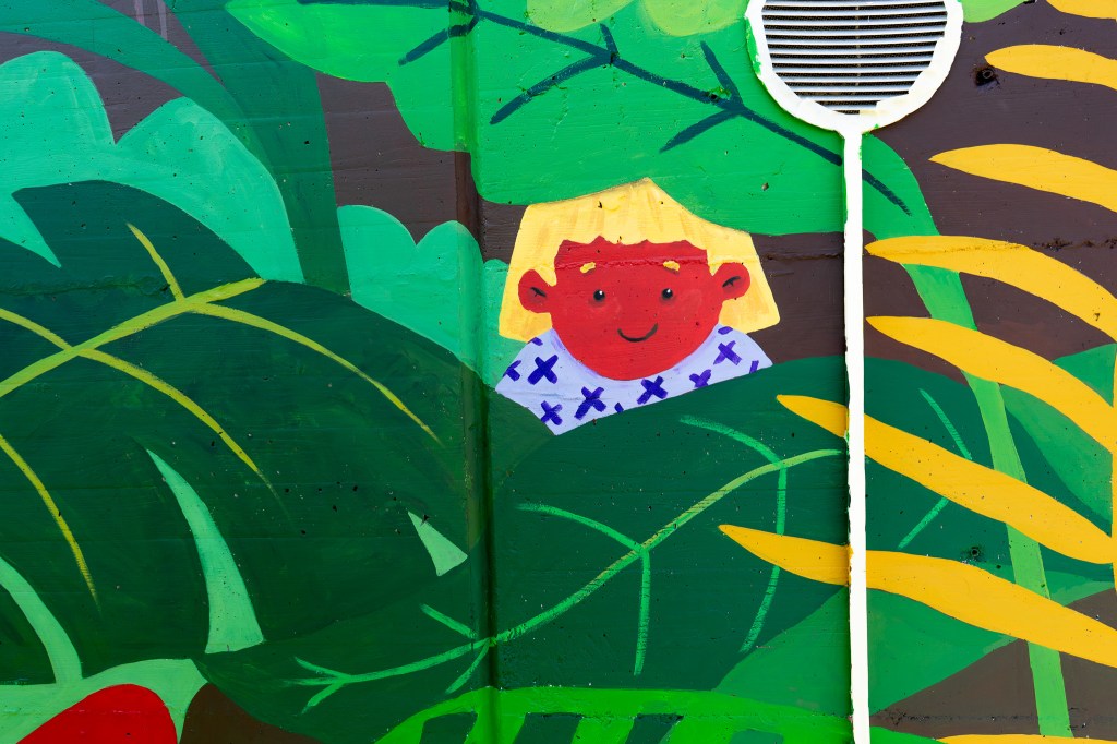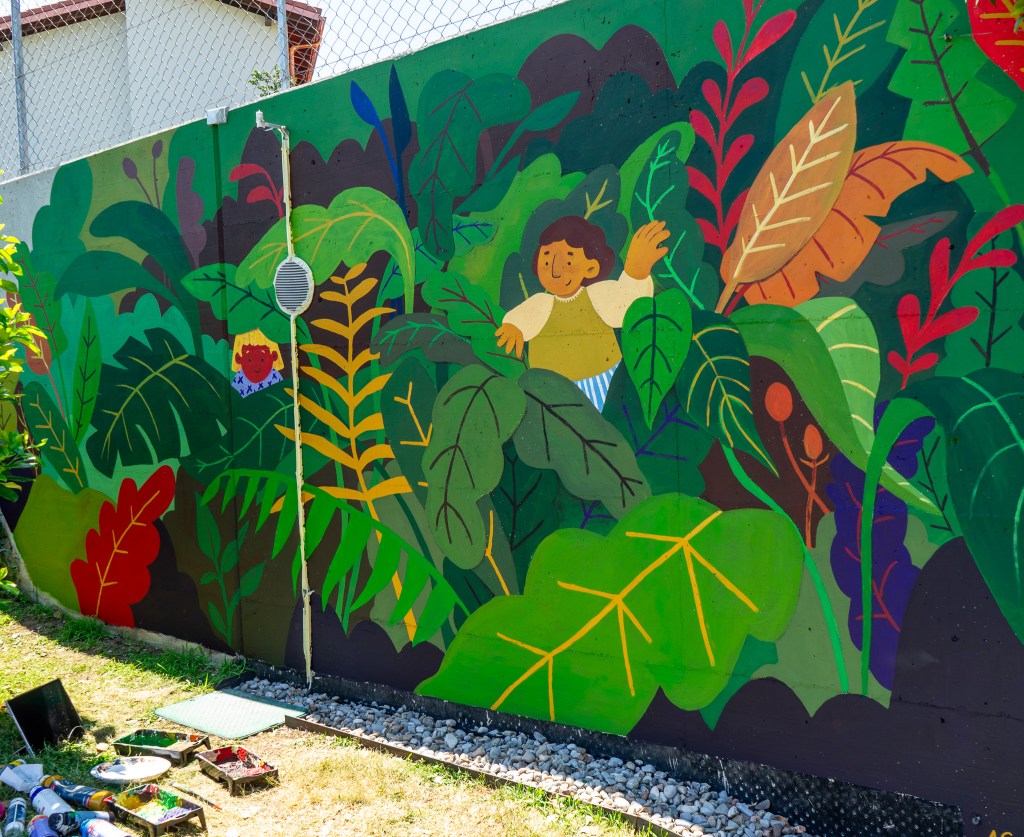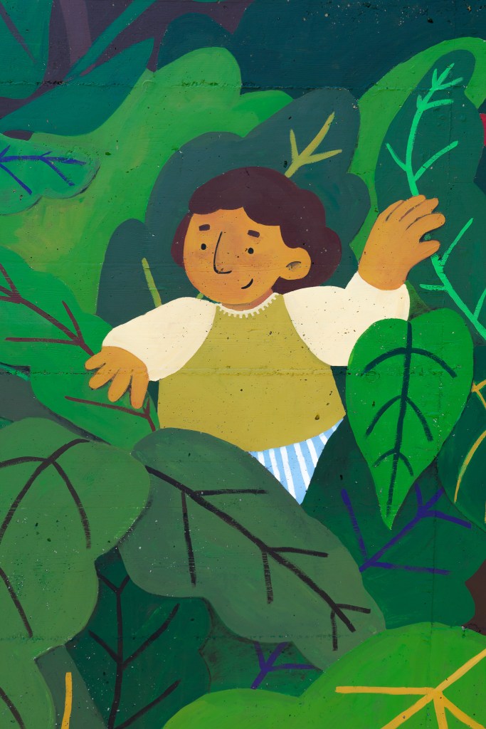 A playful mural on reinforced concrete in a private garden, inspired by plants and nature.